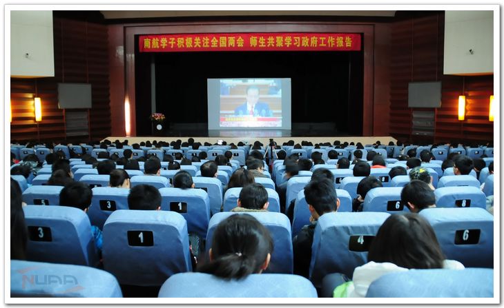3月5日上午,来自全校14个学院的学生骨干代表、少数民族学生代表和全体学生工作人员等500多名师生聚集在将军路校区艺术中心剧场,收看十一届全国人大四次会议开幕式现场直播。本次“申搏学子积极关注全国两会师生共聚学习政府工作报告”人大开幕式直播活动由学生处、研工部举办,旨在以两会召开为契机,在学生中广泛开展形势政策教育。 上午9时,报告会直播正式开始,全体师生随着国歌声的响起,一同起立,共唱国歌。在接下来的2个多小时中,师生们聚精会神地聆听温总理政府工作报告,并不时地记录着。 会后,人文与社会科学学院董英杰同学说:“聆听了政府工作报告,对我了解国情、民情,学习政治与经济理论很有帮助,也更感受到自己肩上的责任。”学生处副处长侍旭表示,通过集体收看“两会”直播,可以让学生有效地了解国家形势与政策,也为思政教育者引导学生关心国家大事、了解社会民生提供了良好的教育契机。 据悉,以两会召开为契机,各学院积极开展形势政策教育,结合实际条件自行安排地点组织学生集体观看温家宝总理政府工作报告,并鼓励学生通过网络、微博、报纸等多种渠道积极了解并参与“两会”活动。航天学院邀请市政协委员与学生一起看两会、说两会,解读与大学生生活和就业息息相关的“两会关键词”;并在直播过程中穿插“微博看两会”互动环节。材料科学与技术学院把“‘两会’直播间”设在了学生宿舍,能源与动力学院学生在总理工作报告结束后就展开了热烈的讨论。 在两会期间,各学院还将通过辅导员月讲评、组织“模拟两会”、“五说”专题讨论等活动创新形式,以年级中心组、班级、团支部、党支部、党章学习小组等为单位,通过召开班、团会,民主生活会,读书(报)交流会,专题思辨会等方式,引导学生对两会进行更加广泛深入地学习。
