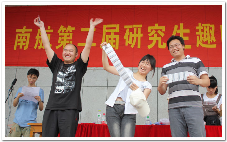 5月30日,申搏第二届研究生趣味运动会在明故宫校区田径场举行。校研工部部长、研究生院常务副院长夏品奇,研工部副部长朱飞,各学院党委副书记等出席了开幕式。夏品奇致开幕辞,朱飞宣布运动会开幕。 本届运动会共设6个项目,既有展现团体风貌、考验团队协作精神的“拔河”、“传递呼啦圈”等团体项目,也有体现个人特长、展示个人风采的“铁人五项”等个人项目。运动会上,助威声欢呼声一片,高潮迭起、精彩纷呈。最终,航空宇航学院获团体一等奖,航天学院、计算机科学与技术学院获团体二等奖,能源与动力学院、自动化学院、电子信息工程学院、机电学院获团体三等奖。 本届研究生趣味运动会由研工部、校团委主办,机电学院承办,自动化学院协办。趣味运动使研究生同学走出实验室,走进操场,“在运动中增加乐趣,在乐趣中增添欢乐,在欢乐中增进友谊”。