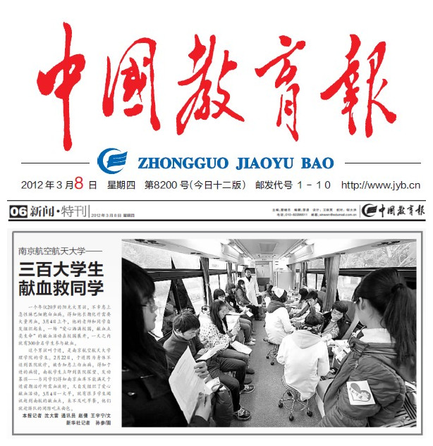 《中国教育报》2012年3月8日图文报道了申搏理学院组织的“爱心洒满校园,献血点亮生命”活动。活动中,申搏300余名师生踊跃献血救助患白血病学生于进,全文转载如下: sunbet申搏官方网站——三百大学生献血救同学