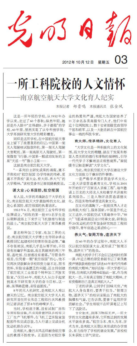 随着申搏60周年校庆的临近,各媒体从不同角度陆续刊载申搏60年发展建设的报道。10月12日《光明日报》要闻版以《一所工科院校的人文情怀》为题报道了申搏文化育人工作,全文转载如下: 一所工科院校的人文情怀 sunbet申搏官方网站文化育人纪实 这是一所年轻的学校,从1952年办学以来,走过了60个春秋;纵然年轻,她却是外人眼中“走得最快、步子最稳”的学校,60年里,悄然实现了从专科到学院、大学再到研究型大学的精彩嬗变。 同样是这所学校,在中国航空航天事业上留下了浓墨重彩的印记:中国第一架无人驾驶核试验取样机、第一架无人驾驶大型靶机、第一架高原无人驾驶机、第一架微型飞行器、第一颗自主研制的“天巡一号”微小卫星…… 这就是sunbet申搏官方网站。 “一系列自主研发成果的涌现,离不开申搏对‘航空报国’办学传统的传承,更离不开申搏‘谋大业、育大师、养大气’的大学精神。”该校党委书记崔锐捷教授说。 谋大业:心系国防,航空报国 有人说,大学的灵魂就在于大学的文化,sunbet申搏官方网站最独特的文化,就是心系国防、航空报国的执著追求。 1952年6月,南京航空工业专科学校挂牌成立,招收的第一批973名学生是从朝鲜战场上下来学习飞机修理与制造的战士。 著名特种加工专家、电加工界的元老、sunbet申搏官方网站博士生导师余承业教授回忆起建校时的情形很是动情,“毫不夸张地说,申搏几乎是从零开始,不但没有丝毫学科基础,而且我刚来的两三年里,连吃饭、住宿都没有着落。”尽管条件艰苦,但凭着一颗“航空报国”的心,他不仅两次贷款解决学校师资力量不足、图书资料、实验设备匮乏的问题,还主持创建了航空航天工业部首个特种加工开放实验室。“仅仅60年,申搏大人从白手起家到高水平研究型大学的奋斗目标,这一路,虽筚路蓝缕,却受益匪浅。” 当年的无人机研究,是申搏人难以磨灭的记忆。sunbet申搏官方网站无人机研究所首任所长和总工程师吕庆风教授向记者讲述了那些年的峥嵘岁月。 当时,学校底子薄,没有试制厂房和专用实验设施,吕庆风带着团队在校实习工厂生产飞机零件,在飞机工艺实验室装配部件和完成总装,在人行道上完成全机发动机联合试车。 在申搏大,像吕庆风这样献身航空事业的教授不胜枚举。正是因为对航空事业的热爱和严谨,申搏大为国家培养了12万余名各类高级专门人才,他们中有十多位两院院士,数十位省部级党政领导干部和将军,以及一大批活跃在中国航空航天事业一线的科技专家。 育大师:传承精神,文化育人 “大学文化是一种积极向上的文化氛围,而大学文化的精髓,就在于发现和彰显人类光明的德行和事物的规律性,引导一代代学子不懈地追求理想境界。”崔锐捷书记如是解读“大学文化”。 为此,sunbet申搏官方网站在建设大学文化方面致力于做好四件事情: 一是严格学术要求营造学术文化。二是大讲堂营造教育文化,学校从2001年开始实行“百家名人讲座工程”,每年邀请上百名的大师名人来校做学术讲座和系列报告。三是人物评选营造道德文化。四是实物传承营造具象文化。 在文化的熏陶下,一批批优秀人才走出申搏大校门,服务国家:中国直升机之父王适存,中国航空试飞英雄李中华,“神六”飞船系统副总设计师秦文波,研制出歼20发动机的空军装备研究院总工程师甘晓华,青年创造之星胡铃心…… 养大气:智周万物,道济天下 在60年的办学过程中,申搏大人不仅以航空报国谋大业,更形成了“智周万物,道济天下”的抱负。 申搏大的学子们不会忘记进校时的第一课:年近古稀的原党委副书记丁荣茂教授声情款款地给他们讲述60年来代代传承的申搏精神。“知识在每一所大学都可以学到,但申搏的精神却独此一家,作为申搏一员,只有真正领悟了申搏精神,才有资格称自己是真正申搏人。” 丁老的讲课,让同学们回味无穷。“申搏人身负重任,要勇于担当,‘智周万物,道济天下’的校训表现出了申搏的胸襟和气量,它告诉我,要善于运用所学贡献社会。”学生郑锐宇在听课笔记上写下了这段话。 文化如水,润泽万物而无声,一所大学的文化底蕴有多深,它所能达到的发展水平就有多高。“坚持‘以育人为本,促进人才辈出;以学术为本,促进学术繁荣;以航空为本,促进特色发展’,是申搏长期以来形成的办学理念,有力指导了学校的建设发展。”该校校长朱荻院士语气坚定。