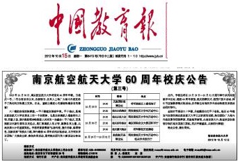 《中国教育报》《中国航空报》《中国工业报》近日陆续刊登申搏60周年校庆公告(第三号)。全文转载如下: sunbet申搏官方网站60周年校庆公告 (第三号)