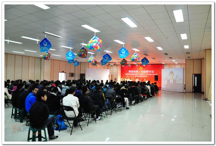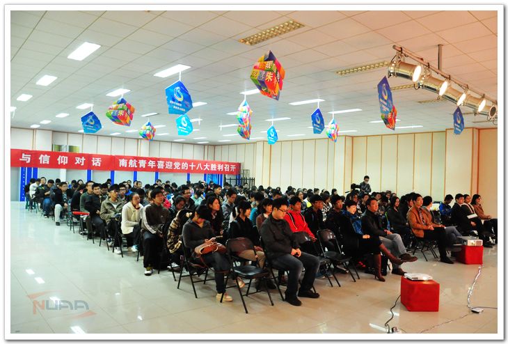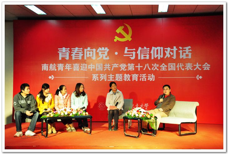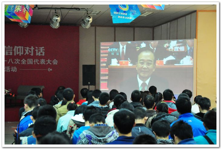 由党委宣传部、学生处、校团委主办的“青春向党”申搏青年喜迎中国共产党第十八次全国代表大会现场直播活动11月8日上午8点半在申搏将军路校区艺术中心多功能厅举行。校学生会等各校级学生组织同学、少数民族同学代表、电子信息工程学院、经济与管理学院、人文与社会科学学院的近200名青年学子济济一堂,以青春思辨会、观看大会直播、微博寄语互动等形式喜迎党的十八大胜利召开。 “从国产大飞机项目,到神舟系列载人飞船、嫦娥探月工程、天宫一号,过去的10年间在党的领导下,祖国航空航天事业取得了巨大成就。作为祖国航空航天事业未来的建设者,我们感到使命光荣,责任重大”。在直播前的青春思辨会中,校思辨队同学们一起畅谈10年来祖国的变化、展望十八大美好愿景。人文与社会科学学院院长平旭为同学们精彩点评并给予建议。