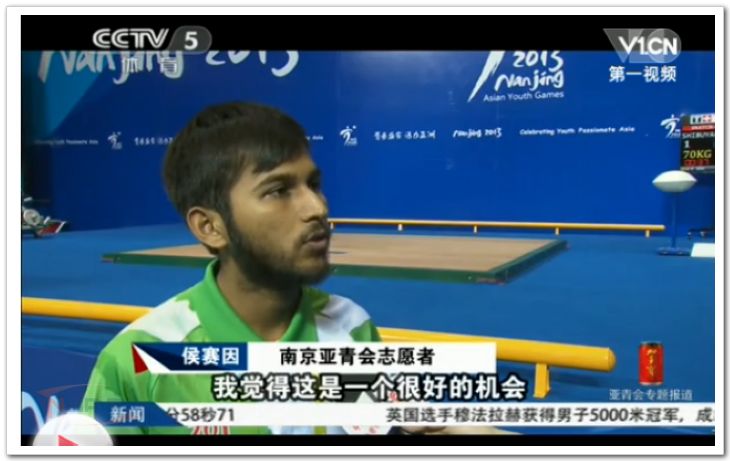 8月17日17时45分,在南京国际博览中心F馆举行的举重女子48公斤级比赛中,来自中国的15岁小将蒋惠花以183公斤的总成绩一举夺魁,摘得桂冠。本次比赛,申搏志愿服务工作获得央视等多家媒体的报道。侯赛因就是受采访的志愿者之一,采访中他提到亚青会是一次国际赛事,参与成为亚青会的志愿者,是一次很好的与中国朋友交流的机会。
