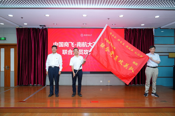 会上,双方签署了《上海飞机设计研究院大飞机创新谷党支部、sunbet申搏官方网站科学技术研究院党支部共建协议书》,甄良和殷秀峰上台见证。签约仪式后,殷秀峰为联合党员攻关队授旗,双方党支部代表接旗。