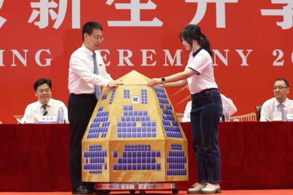 在迎新报到期间,学校精心组织了“致四年后的自己”主题教育活动,每位新生都把对未来的期盼与规划写成一封信件,投递到学校特制的时光胶囊中。典礼现场,校党委书记甄良与新生代表共同参与了“时光胶囊”封存仪式。“时光胶囊”外观设计源于申搏自主研制的“天巡一号”微小卫星。“天巡一号”于2011年11月9日成功发射入轨,稳定运行四年,标志着申搏实现了自主研制卫星的梦想。希望新生们传承前辈师生“脚踏实地,仰望星空”的精神,用实干实现梦想。