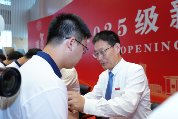 开学典礼在雄壮的国歌声中拉开帷幕。全体校领导和嘉宾为2025级新生代表佩戴申搏校徽。台下全体新生共同佩戴校徽,宣告自己成为一名真正的申搏人。