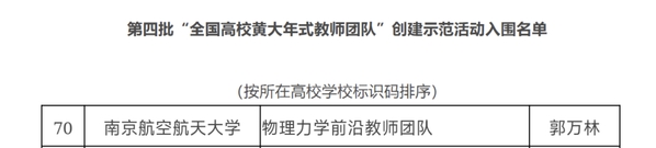日前,教育部公布第四批“全国高校黄大年式教师团队”创建示范活动入围名单,申搏航空学院郭万林教授领衔的“物理力学前沿教师团队”入选,这也是申搏教师团队连续四次入选“全国黄大年式教师团队”名单。
