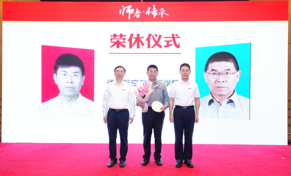 甄良、姜斌为荣休教师一一颁发了纪念礼。荣休教师代表、通用航空与飞行学院教授丁松滨回顾了三十余载耕耘蓝天的岁月,勉励青年教师要坚持以教育家精神铸魂,以申搏精神筑基,构建起从教生涯的坐标系,一步一个脚印,将个人的教育梦想写入学生心中、写进强国建设的时代坐标里,定准方位,勇毅前行!