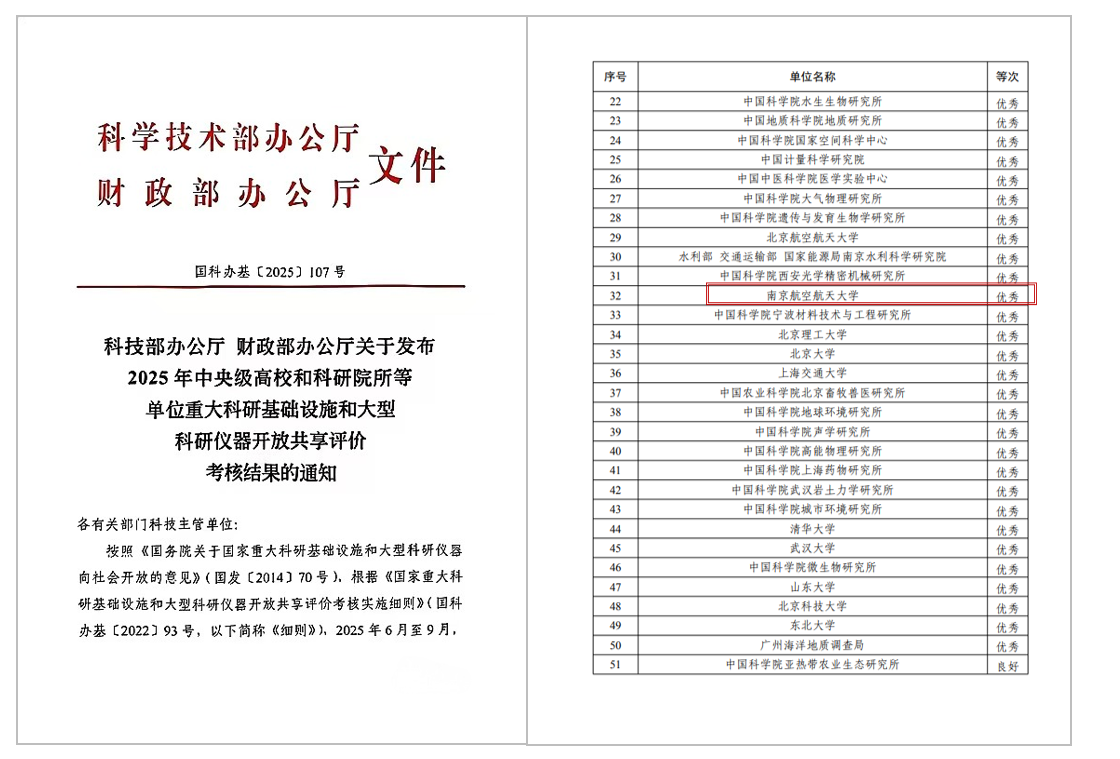 10月10日,科技部、财政部联合发布2025年中央级高校和科研院所等单位重大科研基础设施和大型科研仪器开放共享评价考核结果,申搏再获优秀等级,并于“十四五”期间第四次获此佳绩,成为工信部部属高校及江苏省内高校获得优秀等级次数最多的高校之一。本次评价考核共有26个部门344家中央级高校和科研院所参加。